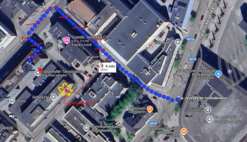 Huomaa, että Google Mapsissa Jyväskylän Tanssiopiston sijainti merkitään hieman väärin, tai ainakin epäkäytännöllisesti. Hyödynnä alapuolista kuvaa tai Gmapsiin merkittyä kävelyohjetta.