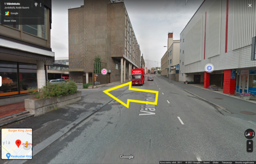 Huomaa, että Googlemapsiin “Jyväskylän Tanssiopisto” -hakusanojen tai katuosoitteen syöttäminen antavat oikean korttelin, mutta väärälle puolelle rakennusta ja ylemmälle katutasolle.